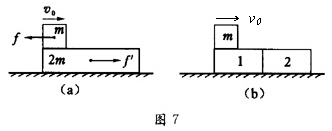 如图7(a)所示,质量为2m的长木板,静止地放在光滑的水平面上,另一质量为m的小铅块(可视为质点)以水平速度v0滑上木板左端,恰能滑至木板右端且与木板保持相对静止,铅块运动中所受的摩擦力始终不变。若将木板分成长度与质量均相等(即m1=m2=m)的两段1,2后紧挨着放在同一水平面上,让小铅块以相同的初速度v0由木板1的左端开始运动,如图7(b)所示,则下列判断正确的是 ( )