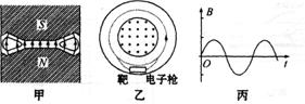 电子感应加速器是加速电子的装置。它的主要部分如图甲所示,划斜线区域为电磁铁的两极,在其间隙中安放一个环行真空室。电磁铁中通以频率约几十赫兹的强大交变电流,使两极间的磁感应强度B往返变化,从而在环行室内感应出很强的涡旋电场。用电子枪将电子注入环行室,它们在涡旋电场的作用下被加速,同时在磁场里受到洛伦兹力的作用,沿圆轨道运动如图乙所示。若磁场随时间变化的关系如图丙所示,则可用来加速电子的B-t图象中 ( )