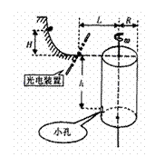 (18分)如图所示,小球从光滑的圆弧轨道下滑至水平轨道末端时,光电装置被触动,控制电路会使转筒立刻以某一角速度匀速连续转动起来。转筒的底面半径为R,已知轨道末端与转筒上部相平,与转筒的转距离为L,且与转筒侧壁上的小孔的高度差为h;开始时转筒静止,且小孔正对着轨道方向. 现让一小;h;开始时转筒静止,且小孔正对着h球从圆弧轨道上的某处无初速滑下,若正好能钻入转筒的小孔(小孔比小球略大,小球视为质点,不计空气阻力,重力加速度为g),求: