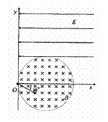 (22分)如图所示,真空中有一以(r,0)为圆心,半径为r的圆柱形匀强磁场区域,磁场的磁感应强度大小为B,方向垂直于纸面向里,在y≥r的范围内,有方向水平向左的匀强电场,电场强度的大小为E;从O点向不同方向发射速率相同的质子,质子的运动轨迹均在纸面内. 已知质子的电量为e,质量为m,质子在磁场中的偏转半径也为r,不计重力及阻力的作用,求: