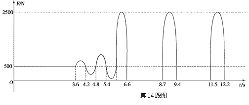 15.(14分)一位蹦床运动员仅在竖直方向上运动,弹簧床对运动员的弹力F的大小随时间t的变化规律通过传感器用计算机绘制出来,如图所示.重力加速度g取10m/s2,试结合图象,求运动员在运动过程中的最大加速度.