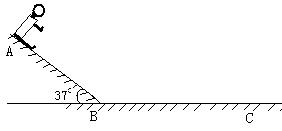 17、(16分)在海滨游乐场里有一种滑沙的游乐活动。如图所示,人坐在滑板上从斜坡的高处由静止开始滑下,滑到斜坡底端B点后沿水平的滑道再滑行一段距离到C点停下来。若某人和滑板的总质量m=60.0kg,滑板与斜坡滑道和水平滑道间的动摩擦因数相同,大小为μ=0.5,斜坡的倾角θ=37°。斜坡与水平滑道间是平滑连接的,整个运动过程中空气阻力忽略不计。重力加速度g=10m/s2。