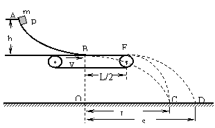 12(20分)如图所示,AB是一段位于竖直平面内的光滑轨道,高度为h,末端B处的切线沿水平方向。一个质量为m的小物体P从轨道顶端处A点由静止释放,滑到B点处飞出,落在水平地面的C点,其轨迹如图中虚线BC所示。已知P落地时相对于B点的水平位移OC=L.现于轨道下方紧贴B点安装一水平传送带,传送带右端E轮正上方与B点相距L/2。先将驱动轮锁定,传送带处于静止状态。使P仍从A点处由静止释放,它离开B端后先在传送带上滑行,然后从传送带上水平飞出,恰好仍落在地面上C点。若将驱动轮的锁定解除,并使传送带以速度