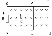 20. 图中EF、GH为平行的金属导轨,其电阻可不计,R为电阻器,C为电容器,AB为可在EF和GH上滑动的导体横杆。有均匀磁场垂直于导轨平面。若用I1和I2分别表示图中该处导线中的电流,则当横杆AB( )