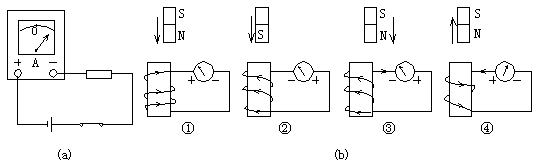 (2)(5分)在做《研究电磁感应现象》的实验中将电流表按图8(a)方式连接并闭合电键时,电流表的指针向右偏转。若把该电流表与一个线圈串联,在图8(b)中分别标明了磁铁的运动方向,线圈的绕向以及感应电流的方向,其中正确的是__________。