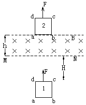 正方形线框在竖直向上的恒力F=21N的作用下,竖直向上通过如图所示的匀强磁场区域。磁场区高度h=1m,磁感应强度B=1T,线框边长L=1m,质量m=0.1kg,电阻R=1Ω。线框在初始位置1处于静止,cd边与磁场的下边缘相距为H。cd边刚进入磁场时,线框刚好做匀速直线运动,线框在末位置2,ab边恰在磁场边缘。(g=10m/s2)