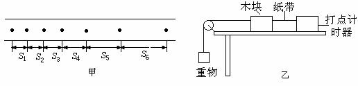 (2)在探究加速度与物体质量、物体受力的关系实验中,实验装置如图6所示:一木块放在水平长木板上,左侧拴有一不可伸长的细软线,跨过固定在木板边缘的滑轮与一重物相连,重物的质量为m .木块右侧与穿过打点计时器的纸带相连,在重物牵引下,木块在木板上向左做匀加速运动.图甲给出了打点计时器在纸带上打出的一些连续的点,它们之间的距离分别为S1、S2、S3、S4、S5、S6,打点计时器所用交流电周期为T.根据以下数据求: