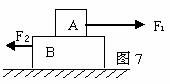 13.(14分)如图7所示,在光滑水平地面上,物体A置于物体B上,且两物体质量均为m,A受到水平力F1,B受到水平力F2,F1>F2,A、B接触面动摩擦因数是μ。求: