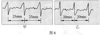 心电图仪(如图9 所示) 通过一系列的传感手段,可将与人心跳对应的生物电流情况记录在匀速运动的坐标纸上,这样医务人员便可得到被检者的心电图。医生通过心电图,可以了解到被检者心跳的情况,例如,测量相邻两波峰的时间间隔,便可计算出1min内心脏跳动的次数(即心率)。同一台心电图仪正常工作时测得待检者甲、乙的心电图分别如图6