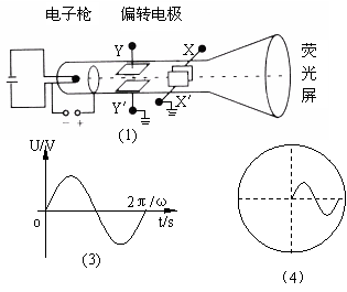D.如果在偏转电极YY′上加上如图⑶所示U=Umsinωt,同时在偏转电极XX′上加上图(2)所示的电压,应观察到一条正弦曲线如图(4)