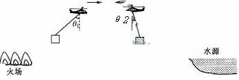 13、直升机沿水平方向匀速飞往水源取水灭火,悬挂着m=500kg空箱的悬索与竖直方向的夹角θ1=450。直升机取水后飞往火场,加速度沿水平方向,大小稳定在a=1.5 m/s2时,悬索与竖直方向的夹角θ2=140。如果空气阻力大小不变,且忽略悬索的质量,谋求水箱中水的质量M。(取重力加速度g=10 m/s2;sin140=0.242;cos 140=0.970)