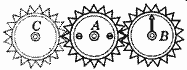 如图所示,A、B是两只相同的齿轮,A被固定不能转动,若B齿轮绕A齿轮运动半周,到达图中的C位置,则B齿轮上所标出的竖直向上的箭头所指的方向是 ( A )