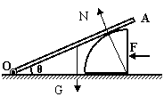 20、(12分)如图所示,横截面为四分之一圆(半径为R)的柱体放在水平地面上,一根匀质木棒OA长为3R,重为G。木棒的O端与地面上的铰链连接,木棒搁在柱体上,各处摩擦均不计。现用一水平推力F作用在柱体竖直面上,使柱体沿着水平地面向左缓慢移动。问: