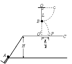 (16分)如图所示,在同一竖直面上,质量为2m的小球A静止在光滑斜面的底部,斜面高度为H=2L。小球受到弹簧的弹性力作用后,沿斜面向上运动。离开斜面后,达到最高点时与静止悬挂在此处的小球B发生弹性碰撞,碰撞后球B刚好能摆到与悬点O同一高度,球A沿水平方向抛射落在水平面C上的P点,O点的投影O/与P的距离为L/2。已知球B质量为m,悬绳长L,视两球为质点,重力加速度为g,不计空气阻力,求: