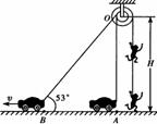 摄制组在某大楼边拍摄武打片,要求特技演员从地面飞到屋顶.如图所示,若特技演员质量m=50 kg,导演在某房顶离地H=12 m处架设了轮轴(轮与轴有相同的角速度),轮和轴的直径之比为3:2(人和车均视为质点,且轮轴直径远小于H),若轨道车从图中A匀速前进到B,速度v=10m/s,绳BO与水平方向的夹角为53°,则由于绕在轮上细钢丝的拉动,使演员由地面从静止开始向上运动.在车从A运动到B的过程中(g取10 m/s2,sin53°=0.8,cos53°=0.6) ( )