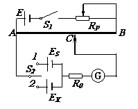 (2)(6分)如图所示为一种测量电源电动势的电路原理图. E为供电电源,ES为标准电源,EX为待测电源,RP是限流电阻,R0是电流表的保护电阻,AB是均匀电阻丝,长度为L. 闭合S1进行测量时,先将S2合到“1”位置,移动C至C1处时,恰好使电流表指针指零,测得AC1=