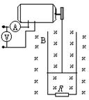 Ⅰ. 如图所示,电动机用轻绳将一根金属棒沿着竖直放置的足够长的光滑平行导轨匀速提升。已知金属棒的质量为0.1kg,,长1m,电阻不计。电阻同样可以略去不计的导轨下端用阻值为1.5Ω的电阻R连接,整个导轨区域处在垂直于导轨平面的匀强磁场中,磁场的磁感强度为1T,已知电动机的内阻1Ω,两端所加电压10V, 金属棒上升的速度是3m/s,g取10m/s2。求: