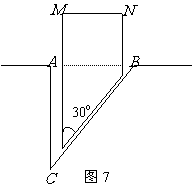 20.(7分)如图7,是木工用凿子工作时的截面示意图,三角形ABC为直角三角形, ∠C=300。用大小为F=100N的力垂直作用于MN,MN与AB平行。忽略凿子的重力,求这时凿子推开木料AC面和BC面的力分别为多大?