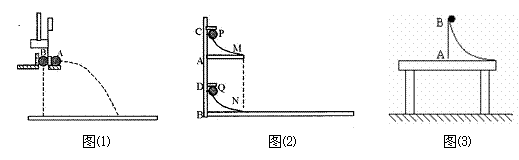 (2)乙同学采用如图(2)所示的装置。两个相同的弧形轨道M、N,分别用于发射小铁球 P、Q,其中N的末端与可看作光滑的水平板相切;两轨道上端分别装有电磁铁C、D;调节电磁铁C、D的高度,使AC=BD,从而保证小铁球P、Q在轨道出口处的水平初速度v0相等,现将小铁球P、Q分别吸在电磁铁C、D上,然后切断电源,使两小铁球能以相同的初速度v0同时分别从轨道M、N的下端射出。实验可观察到的现象应是