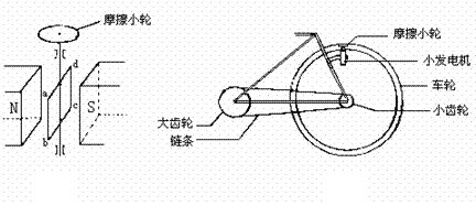 (2)假定摩擦小轮与自行车车轮之间无相对滑动,已知自行车的车轮半径为r=35cm,摩擦小轮半径r0=1.00cm。线圈匝数为800匝,每匝线圈面积为s=20cm2。线圈的总电阻R1=40Ω,磁场B=0.01T。小发电机向自行车车头灯供电,车头灯电阻R2=10Ω。当自行车车轮转动的角速度ω0=8rad/s时。求: