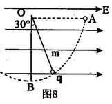 17.(10分)如图8所示,一个质量为m,带电量为q的带电小球,用长为L的绝缘轻质细线悬挂于匀强电场中的O点,静止时细线偏离竖直方向30°角.