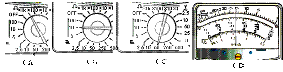 5.(6分).图中A、B、C是多用表在进行不同测量时转换开关分别指示的位置,D是多用表指针在测量时的偏转位置,由此可知