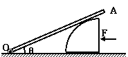 (10分)如图所示,横截面为四分之一圆(半径为R)的柱体放在水平地面上,一根匀质木棒OA长为4R,重为G。木棒的O端与地面上的铰链连接,木棒搁在柱体上,各处摩擦均不计。现用一水平推力F作用在柱体竖直面上,使柱体沿着水平地面向左缓慢移动。问: