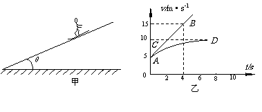 5、质量为40kg的雪撬在倾角θ=37°的斜面上向下滑动(如图甲所示),所受的空气阻力与速度成正比。今测得雪撬运动的v-t图像如图7乙所示,且AB是曲线的切线,B点坐标为(4,15),CD是曲线的渐近线。试求空气的阻力系数k和雪撬与斜坡间的动摩擦因数μ。