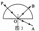 如图3所示,只含绿光和紫光的复色光束PO,沿半径方向射入空气中的玻璃半圆柱后,被分成两光束OA和OB沿如图所示方向射出。则以下说法可能的是 ( )