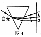 如图4所示,一细束白光通过三棱镜后分为各种单色光,取其中a、b、c三种单色光,并同时做如下实验:①让这三种单色光分别通过同一双缝干涉实验装置在光屏上产生干涉条纹(双缝间距和缝屏间距均不变);②让这三种单色光分别照射锌板;③让这三种单色光分别垂直投射到一条直光纤的端面上;则下列说法正确的是(