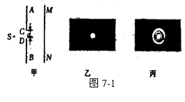 如图7-1所示,甲图中S为点光源,AB为一遮光板,CD表示AB上透光部分,C、D之间的距离d可以调节MN为光屏,乙图和丙图上的白色部分表示光通过CD在屏上得到的图则下列说法中正确的是( )