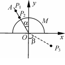 25.如图所示,画有直角坐标系Oxy的白纸位于水平桌面上,M是放在白纸上的半圆形玻璃砖,其底面的圆心在坐标原点,直边与x轴重合。OA是画在纸上的直线,P1,P2为竖直地插在直线OA上的两枚大头针,P3是竖直地插在纸上的第三枚大头针,a是直线OA与y轴正方向的夹角,β是直线OP3与y轴负方向的夹角,只要直线OA画得合适,且P3的位置取得正确,测出角a和β,便可求得玻璃的折射率。