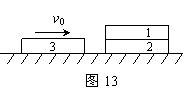 18. 如图13所示为三块质量均为m,长度均为L的木块。木块1和木块2重叠放在光滑的水平桌面上,木块3沿光滑水平桌面运动并与叠放在下面的木块2发生碰撞后粘合在一起,如果要求碰后原来叠放在上面的木块1完全移到木块3上,并且不会从木块3上掉下,木块3碰撞前的动能应满足什么条件?设木块之间的动摩擦因数为m