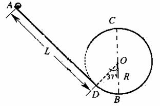 15.(12分)“翻滚过山车”的物理原理可以用如图所示装置演示。光滑斜槽轨道AD与半径为R=0.1m的坚直圆轨道(圆心为O)相连,AD与圆O相切于D点,B为轨道的最低点,∠DOB=37°。质量为m=0.1kg的小球从距D点L=1.3 m处静止开始下滑,然后冲上光滑的圆形轨道(g=10m/s2,sin37°=0.6,cos37°=0.8)。求: