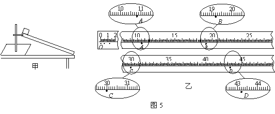 10.(6分)用铁架台将长木板倾斜支在水平桌面上,组成如图甲所示装置(示意图5),测量木块沿斜面下滑的加速度。所提供的仪器有长木板、木块、打点计时器(含纸带)、学生电源、米尺、铁架台及导线、开关等。图乙是打点计时器打出的一条纸带,纸带旁还给出了最小刻度为1mm的刻度尺,刻度尺的零刻度线与O点对齐。A、B、C、D为四个相邻的计数点,相邻计数点间还有四个点未标出。打点计时器所用交流电源的频率是50Hz。