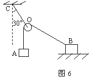 13.(18分)如图6所示,绳OC与竖直方向成30°角, O为质量不计的滑轮,绳与滑轮间摩擦不计,已知物B重1000N,物A重400N,物A、B均静止。求: