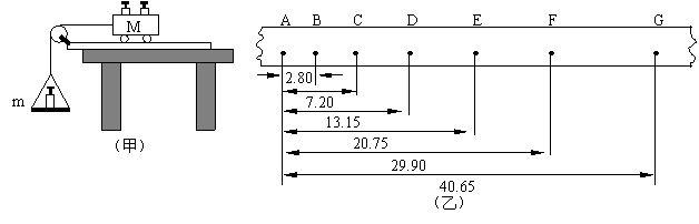 在探究加速度与力、质量的关系的实验中,采用如图(甲)所示实验装置。自实验中,用打点计时器打出的一条较理想的纸带,纸带上A、B、C、D、E、F、G为七个相邻的计数点,相邻计数点间的时间间隔是0.1s,距离如图(乙)所示,单位是cm。