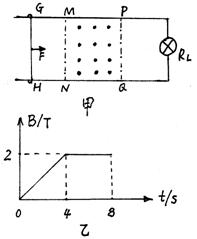 8(15分)光滑平行金属导轨水平面内固定,导轨间距L=0.5m,导轨右端接有电阻RL=4Ω小灯泡,导轨电阻不计。如图甲,在导轨的MNQP矩形区域内有竖直向上的磁场,MN、PQ间距d=3m,此区域磁感应强度B随时间t变化规律如图乙所示,垂直导轨跨接一金属杆,其电阻r=1Ω,在t=0时刻,用水平恒力F拉金属杆,使其由静止开始自GH位往右运动,在金属杆由GH位到PQ位运动过程中,小灯发光始终没变化,