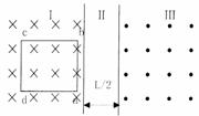 9 (15分)如图所示,Ⅰ、Ⅲ为两匀强磁场区,Ⅰ区域的磁场方向垂直面向里,Ⅲ区域的磁场方向垂直纸面向外,磁感应强度均为B,两区域中间为宽L/2的无磁场区Ⅱ,有一边长为L,粗细均匀各边电阻为R的正方形金属框abcd置于区域ab边与磁场边界平行,现拉着金属框以速度v水平向右匀速移动.