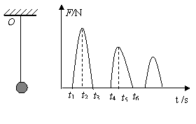18、利用传感器和计算机可以研究快速变化力的大小。实验时,把图所示中的小球举高到绳子的悬点O处,然后让小球自由下落。用这种方法获得的弹性绳的拉力F随时间t变化图线如图所示。根据图线所提供的信息,以下判断正确的是: ( )