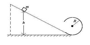 而成,圆形轨道的半径为R。一质量为m的小物块从斜轨道上某处由静止开始下滑,然后沿圆形轨道运动。要求物块能通过圆形轨道最高点,且在该最高点与轨道间的压力不能超过5mg(g为重力加速度)。求物块初始位置相对圆形轨道底部的高度h的取值范围。