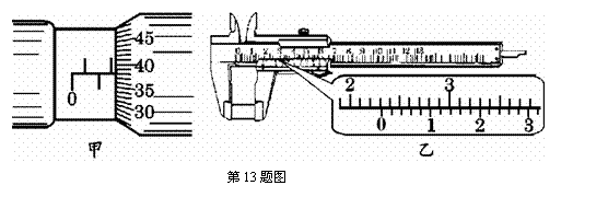 13. (4分)图甲为用螺旋测微器、图乙为用游标尺上有50个等分刻度的游标卡尺测量工件的情况,请读出它们的读数.甲:读数为 mm 乙:读数为 mm