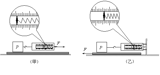 (2)(6分)如图8所示的甲、乙两图表示用同一套器材测量铁块P与长金属板间的滑动摩擦力的两种不同方法。甲图使金属板静止在水平桌面上,用手通过弹簧秤向右用力F拉P,使P向右运动;乙图把弹簧秤的一端固定在墙上,用力F水平向左拉金属板,使金属板向左运动。