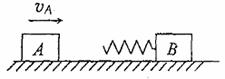 18.(16分)在光滑的水平轨道上有A、B滑块,B滑块的质量为mB,上面装有一个质量不计的轻弹簧,A滑块质量为mA,它以速度vA撞击B,如图所示。