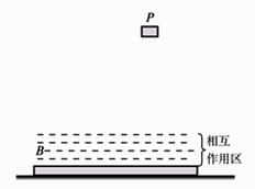 16.(15分)如图所示,P为位于某一高度处的质量为m的物块,B为位于水平地面上的质量为M的特殊长平板,=,平板与地面间的动摩擦因数为m=0.1。在板的上表面上方,存在一定厚度的“相互作用区域”,如图中划虚线的部分,当物块P进入相互作用区时,B便有竖直向上的恒力f作用于P,f=11mg,f对P的作用使P刚好不与B的上表面接触;在水平方向P、B之间没有相互作用力。已知物块P开始自由落下的时刻,板B向右的速度为v0=10.0 m/s。P从开始下落到刚到达相互作用区所经历的时间为T0=1s。 设B板足够长,保证物块P总能落入B板上方的相互作用区,取重力加速度g=10m/s2。求: