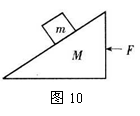 的斜面上,斜面的质量M=2kg,斜面与物体的动摩擦因数μ=0.2,地面光滑,现对斜面体施加一水平推力,如图10所示。要使物体m相对斜面静止,力F的取值范围应为多大?设物体与斜面的最大静摩擦力等于滑动摩擦力。(