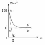(16分)神州六号飞船返回舱返回时,推进器制动发动机点火,使飞船由运行轨道进入返回轨道,随后推进器和返回舱分离。穿越“黑障区”一段时间后,打开减速伞减速,然后打开主伞进一步减速,为简化返回舱穿过“黑障区”后的减速过程,从某时刻起开始计时,返回舱的v-t图像如图,图中AE是曲线在A点的切线,切线交横轴于一点E,其坐标为(8,0),CD是AB的渐近线。返回舱总质量是M=400kg,g=10m/s2.试问: