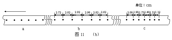 12.如图11(a)所示,小车放在斜面上,车前端栓有不可伸长的细线,跨过固定在斜面边缘的小滑轮与重物相连,小车后面与打点计时器的纸带相连。起初小车停在靠近打点计时器的位置,重物到地面的距离小于小车到滑轮的的距离。启动打点计时器,释放重物,小车在重物的牵引下,由静止开始沿斜面向上运动,重物落地后,小车会继续向上运动一段距离。打点计时器使用的交流电频率为50 Hz。图11(b)中a、b、c是小车运动纸带上的三段,纸带运动方向如箭头所示。