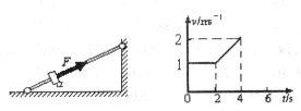 14.(8分)固定光滑细杆与水平地面成一定倾角,在杆上套有一个光滑小环,小环在沿杆方向向上的推力F作用下向上运动.0-2s内推力的大小为 5 .0N,2-4s 内推力的大小变为 5.5N ,小环运动的速度随时间变化规律如图所示,(取g = 10 m/s 2 ).求: