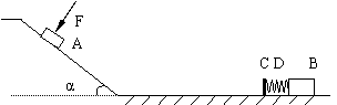 18、如图所示,粗糙斜面与光滑水平面通过半径可忽略的光滑小圆弧平滑连接,斜面倾角α=370,A、B是两个质量为m=1kg的小滑块(可视为质点),C左端附有胶泥的质量不计的薄板,D为两端分别连接B和C的轻质弹簧。当滑块A置于斜面上且受到大小为F=4N,方向垂直于斜面向下的恒力F作用时,恰能向下匀速运动。现撤去F,让滑块A从斜面上距斜面底端L=1m处由静止下滑,若g=10m/s2 ,sin370 = 0.6 ,cos370 = 0.8 。